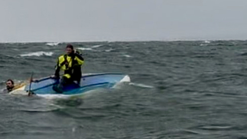 Jollen bliver på samme måde rejst op i alt tre gange og kæntrer hver gang til læ.